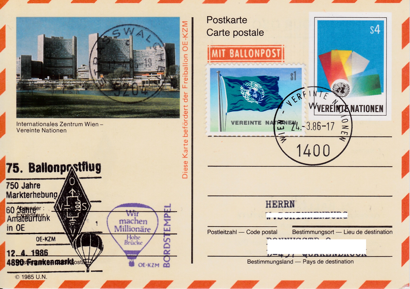 Diese Bildpostkarte (Ganzsache mit Zudruck) mit Zusatzfrankatur wurde am 24.3.1986 für den 75. Ballonpostflug der Österreichischen Pro Juventute mit dem Freiballon OE-KZM in Wien beim UNO-Postamt aufgegeben. Sie erhielt einen Tagesstempel Wien - Vereinte Nationen. Am 12.4.1986 wurde der Sonderstempel mit der Kennziffer "1" aus Frankenmarkt zu diesem Ballonflug auf der Karte abgeschlagen. Sie erhielt zusätzlich einen Tagesstempel Strasswalchen mit dem Kennbuchstaben "c" und einen Bordstempel.
