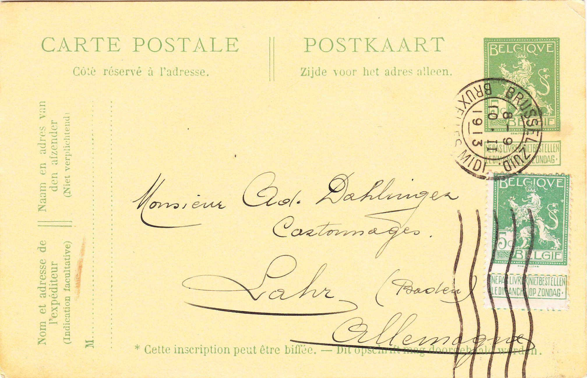 Ganzsache aus Belgien, aufgegeben am 10.02.1913 in Brüssel, gelaufen nach Lahr in Baden in Deutschland: