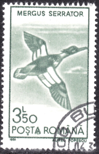 Aus Rumänien kommt diese Marke (MiNr 4647) mit einem weiteren Mittelsäger (Mergus serrator).