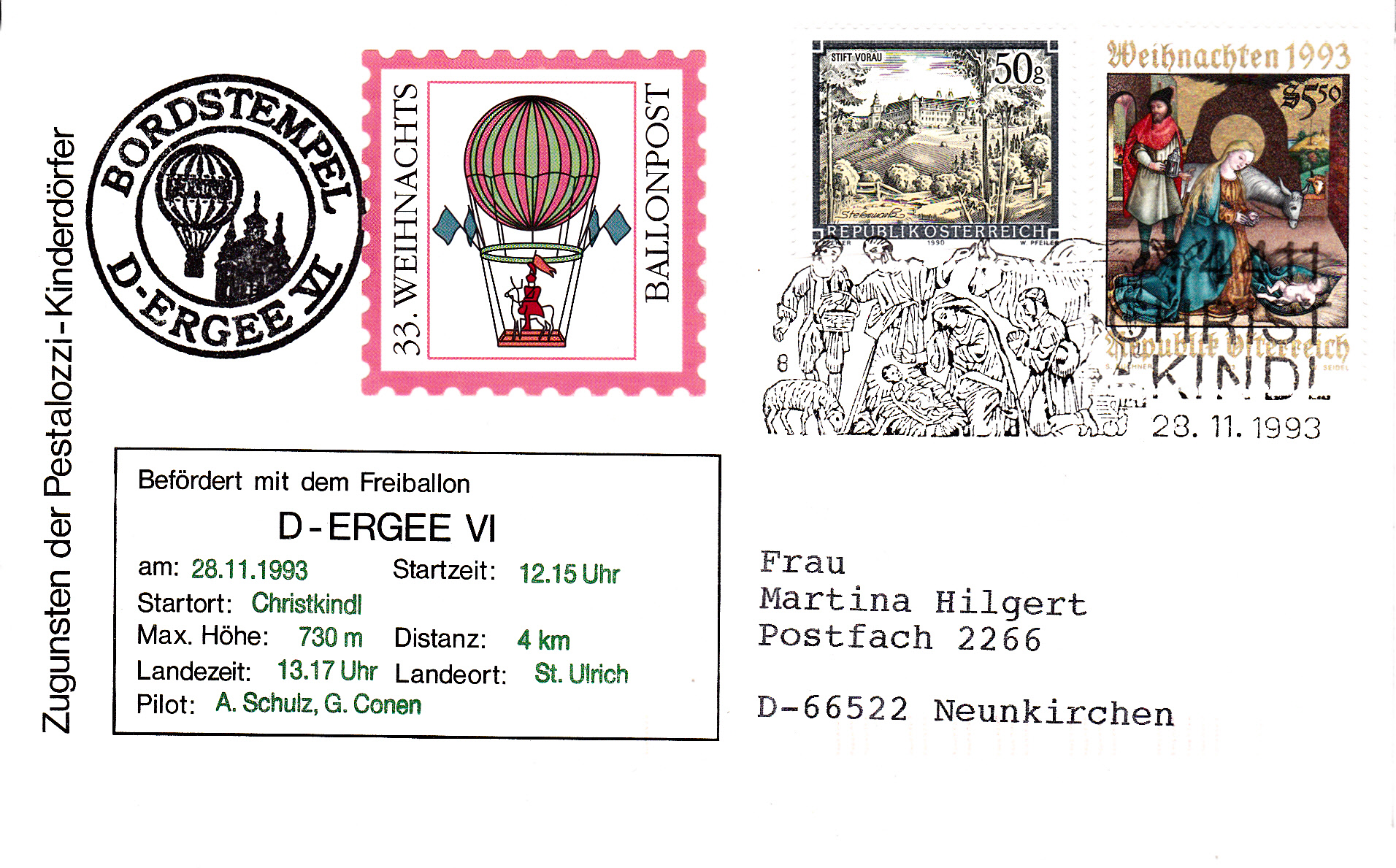 Der Brief wurde am 25.11.1993 in Gaflenz aufgegeben und an das PA Christkindl zum Stempeln am Ersttag der Weihnachtsmarke 1993 weitergeleitet.