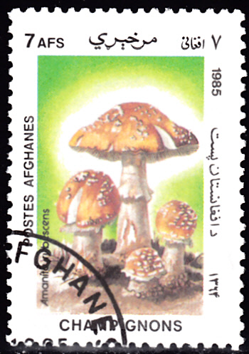 Auf dieser Marke aus Afghanistan (MiNr 1413) wird der Perlpilz (Amanita rubescens) gezeigt.