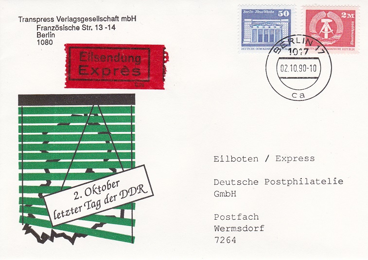Diese Eilboten-Sendung von Berlin nach Wermsdorf erinnert an den Tag der Deutschen Einheit, den 03.10.1990.