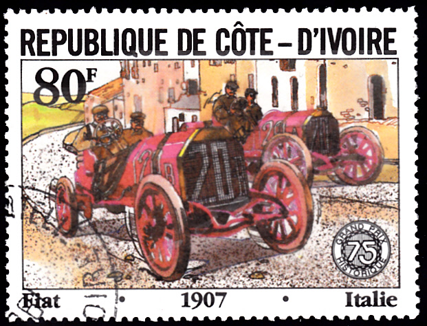 Eine weitere Marke dieser Serie aus der Elfenbeinküste (MiNr 708) zeigt zwei Fiat-Rennwagen aus dem Jahre 1907.