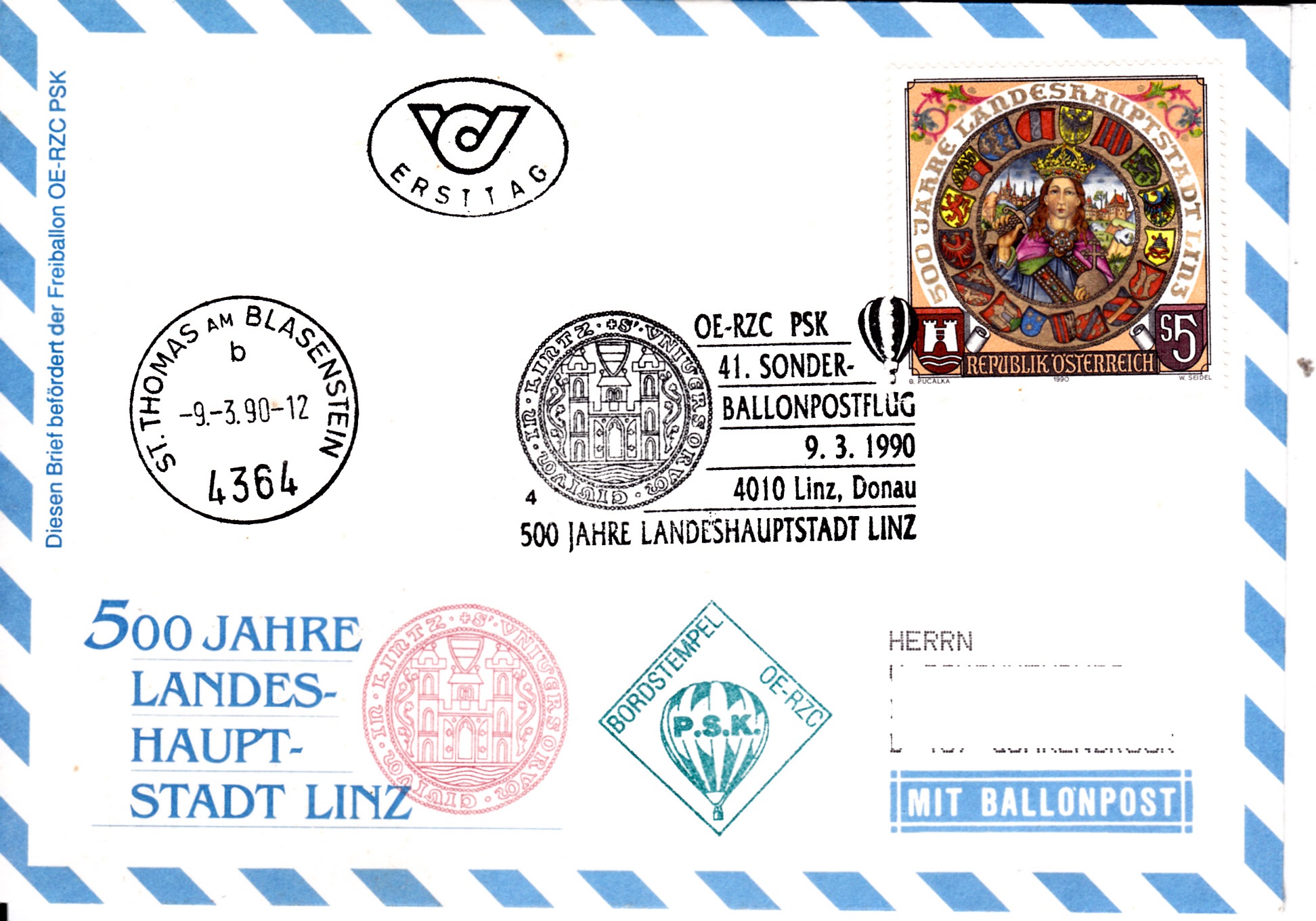 Dieser Brief wurde am 9.3.1990 in Linz für den 41. Sonder-Ballonpostflug der Österreichischen Pro Juventute mit dem Freiballon OE-RZC aufgegeben. Er erhielt den Sonderstempel mit der Kennziffer "4" aus Linz zu diesem Ballonflug und wurde am gleichen Tag mit dem Freiballon OE-RZC befördert. Er erhielt zusätzlich einen Stempel "Ersttag", einen Bordstempel und einen Tagesstempel aus St. Thomas am Blasenstein.
