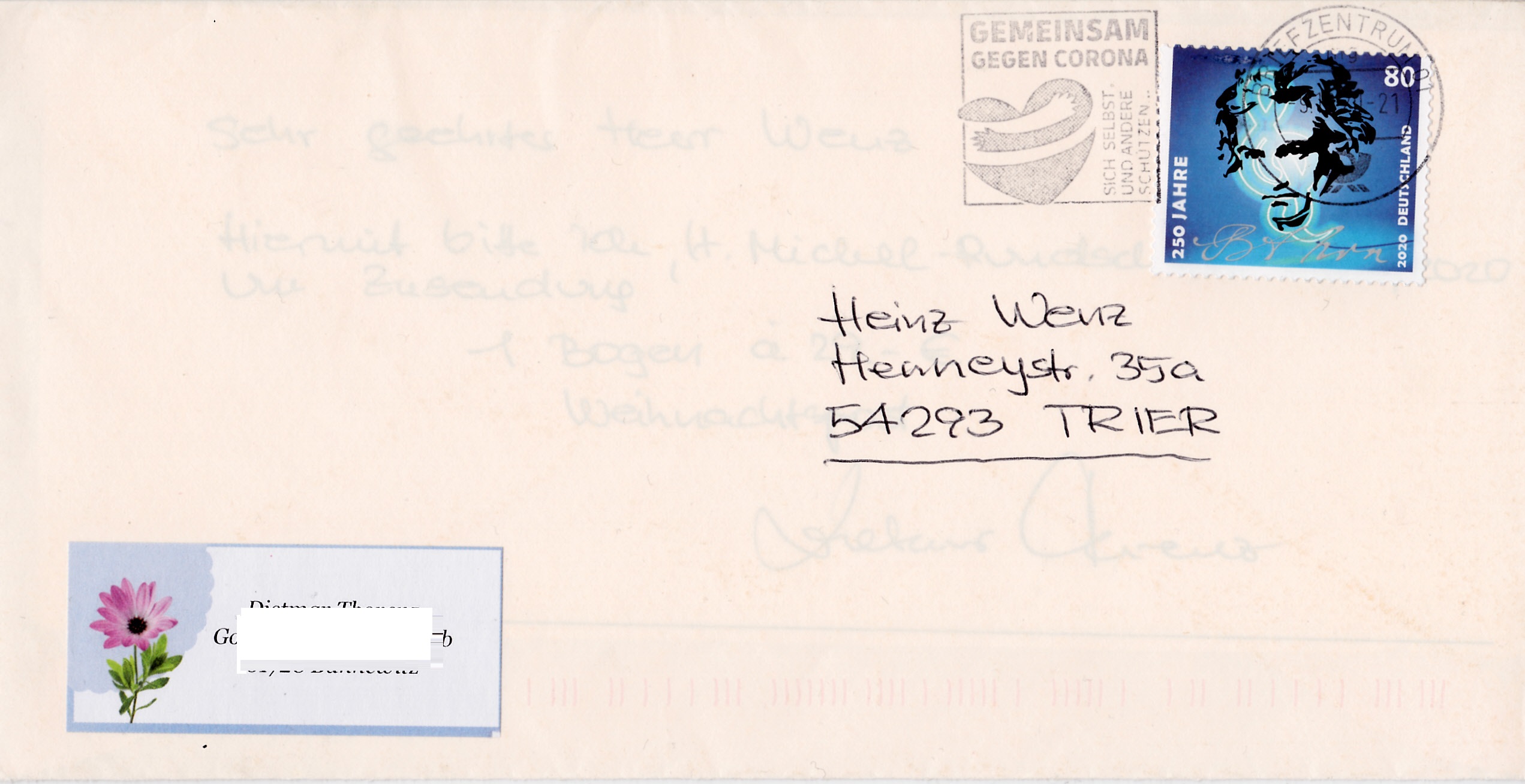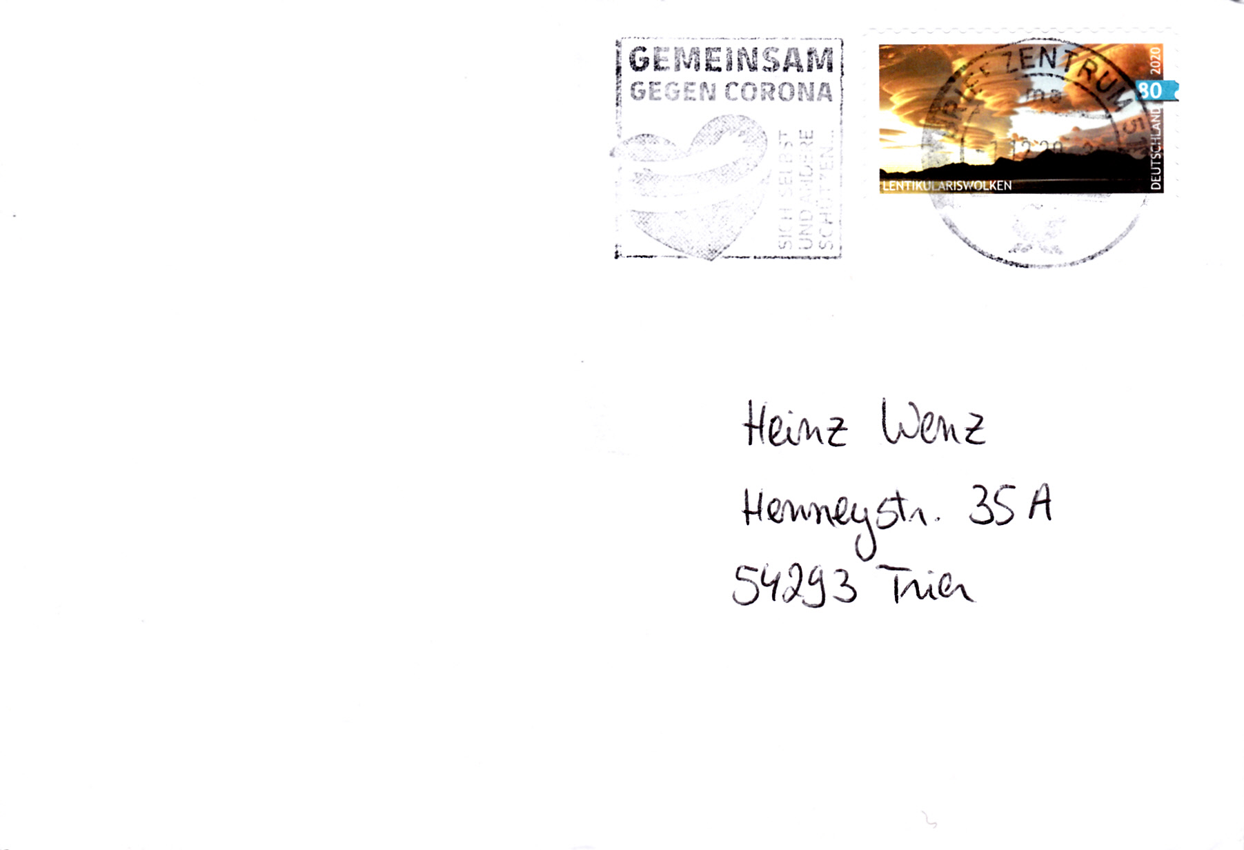 mir sind einige neue Belege mit den neuen Tintenstrahl-Entwertungen in die Hände gekommen, die hier gleich gezeigt werden sollen. Den Anfang macht ein Brief aus dem Briefzentrum 46 vom 15.6.20 mit dem Werbezusatz der Kinder-Nothilfe.
