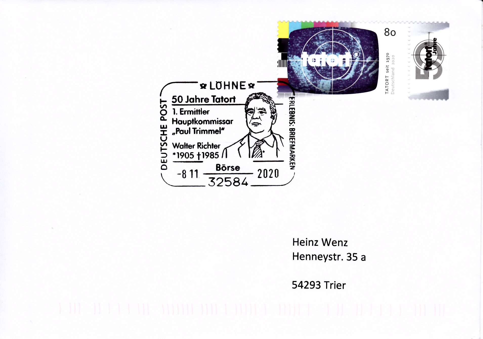 Zum Jubiläum "50 Jahre Tatort" ist bei der Deutschen Post AG eine Marke (MiNr 3572) mit dem Fernsehbild einer Szene aus dem Vorspann der Serie "Tatort". Hier zeige ich eine Marke vom Eckrand mit EAN-Codierung.