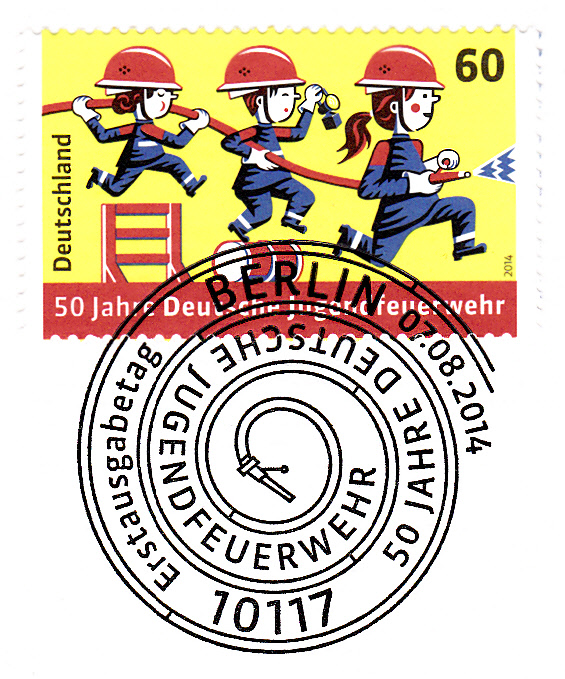 Marke "50 Jahre Deutsche Jugendfeuerwehr" der Deutschen Post AG (MiNr 3099) mit dem Ersttagsonderstempel Berlin vom 7.8.2014.
