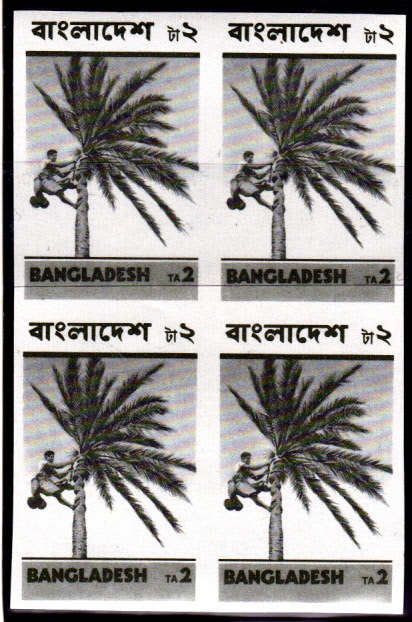 Auf dieser Marke zu 2 Taka (MiNr 33) ist die Kokosnussernte dargestellt. Auch hier gibt es wieder zwei Typen mit den unterschiedlichen Währungbezeichnungen.