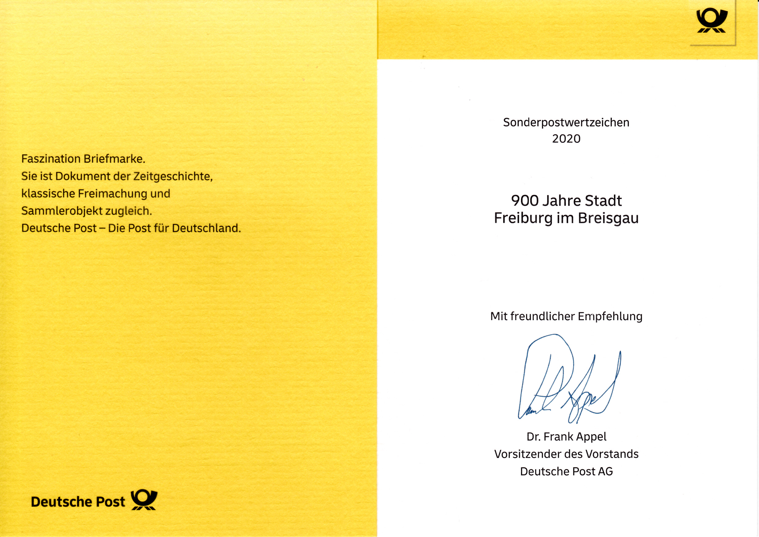 Klappkarte des Vorstandsvorsitzenden der Deutschen Post AG mit einer Marke "900 Jahre Stadt Freiburg im Breisgau" (MiNr 3553) und dem Ersttagsonderstempel Bonn.