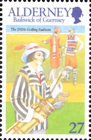 Eine zweite Marke dieser Serie (MiNr 174) bildet Golfspieler in der "Golfmode" aus der Zeit um 1920 gekleidet sind.
