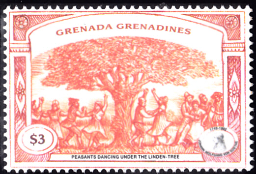 Zum 250. Geburtstag von Johann Wolfgang von Goethe erschien in Grenada/Grenadinen in einer Serie diese Marke (MiNr 2939) mit einer Darstellung zu "Bauern unter der Linde" (Faust).