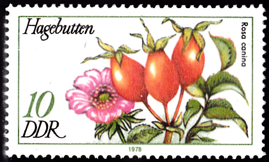 Eine Marke aus der Serie "Arzneipflanzen" der DDR (MiNr 2287) bildet eine Blüte und Hagebutten der Hunds- oder Heckenrose (Rosa canina) ab.