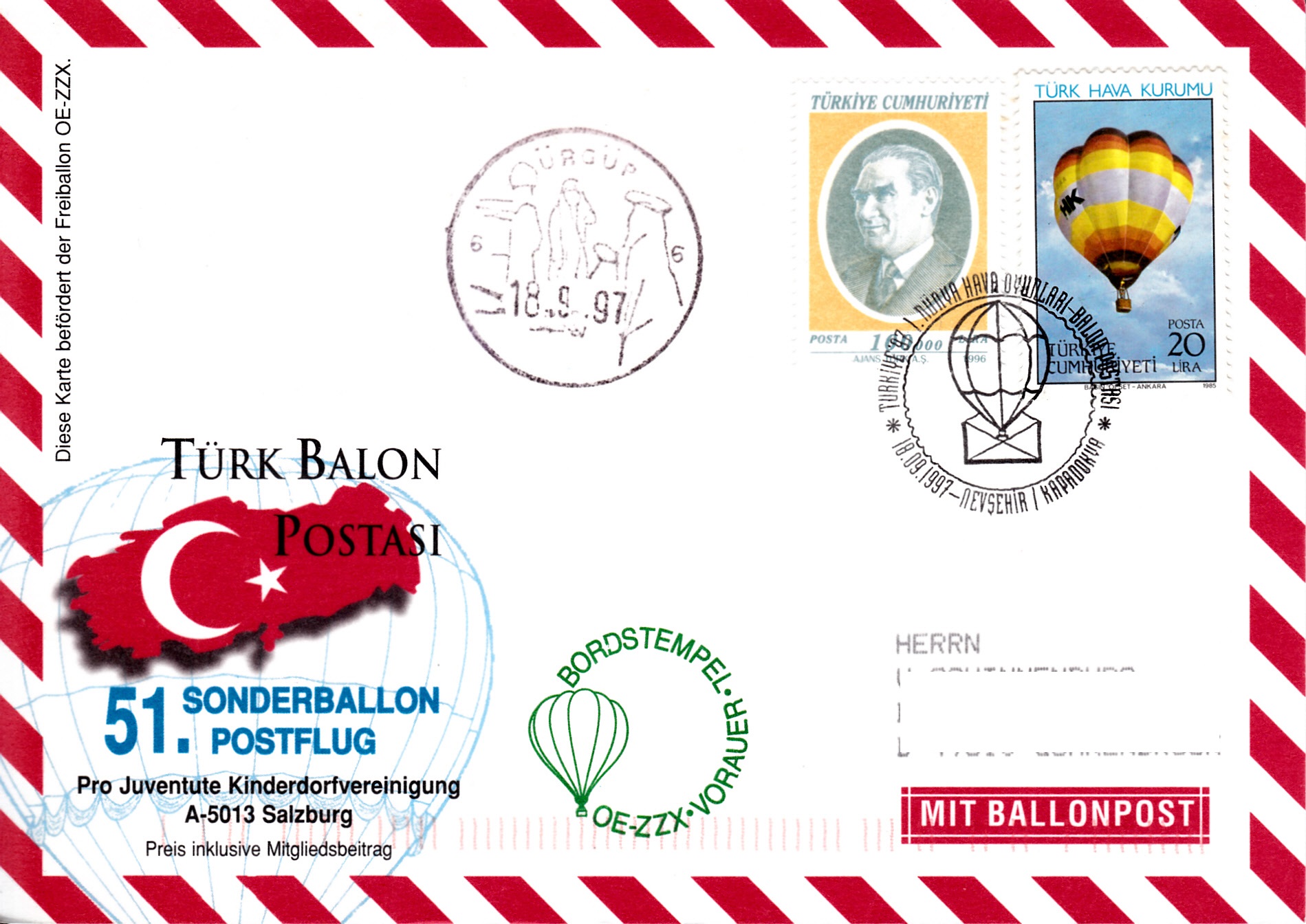 Am 18.9.1997 fand der 51. Sonder-Ballonpostflug der Österreichischen Pro Juventute mit dem Freiballon OE-ZZX in der Türkei statt, wie diese Karte belegt.