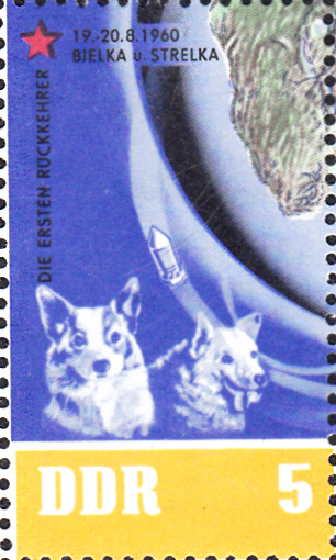 Eine Marke aus der Ausgabe "5 Jahre sowjetische Weltraumflüge" der DDR (MiNr 926) zeigt auch die beiden Weltraumhunde Belka und Strelka und Sputnik 5.