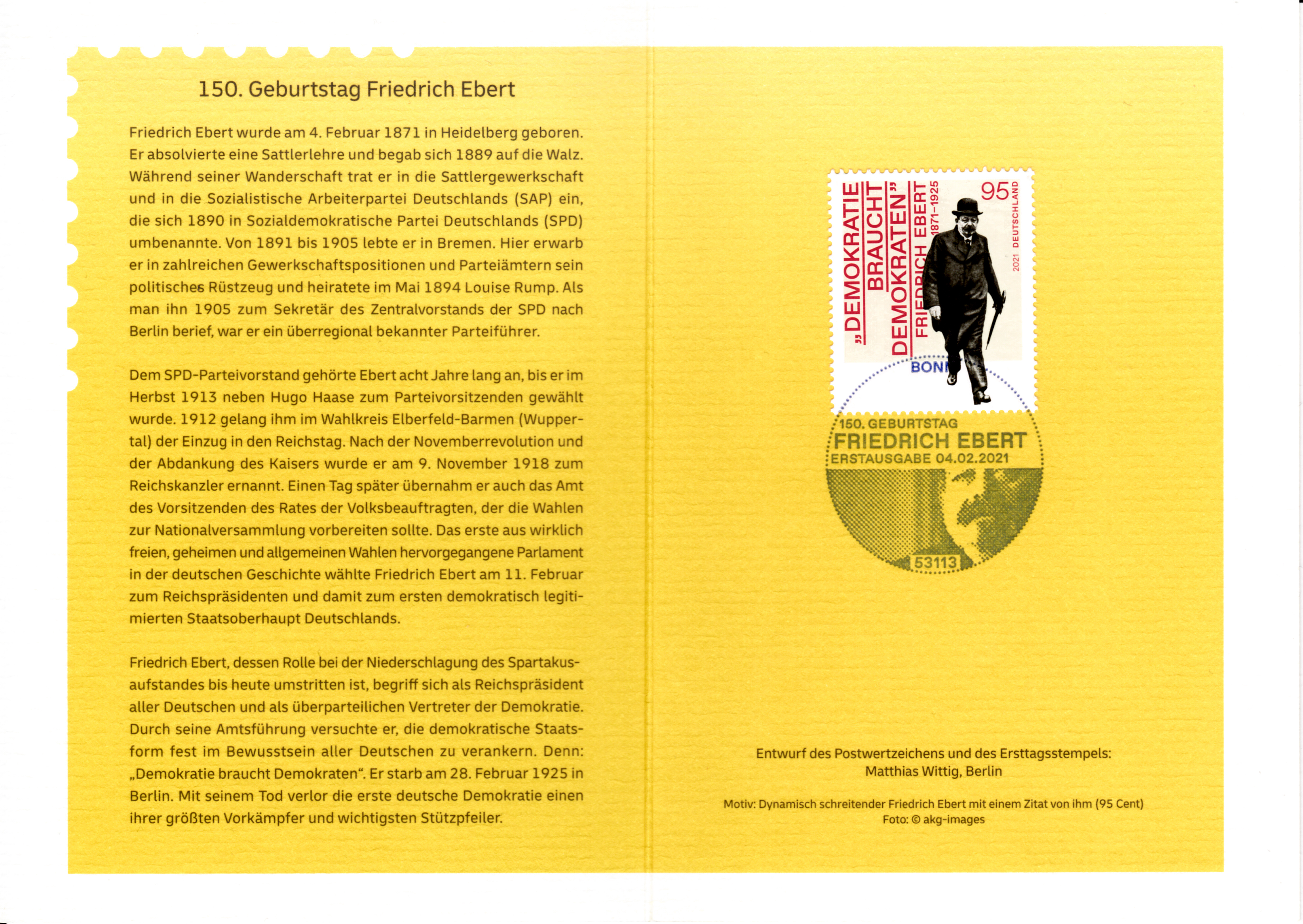 Am 10.7.2021 wurde in Heidelberg ein weiterer Sonderstempel zu einem Aktionstag zum 150. Geburtstag von Friedrich Ebert im Geburtshaus von Ebert eingesetzt.