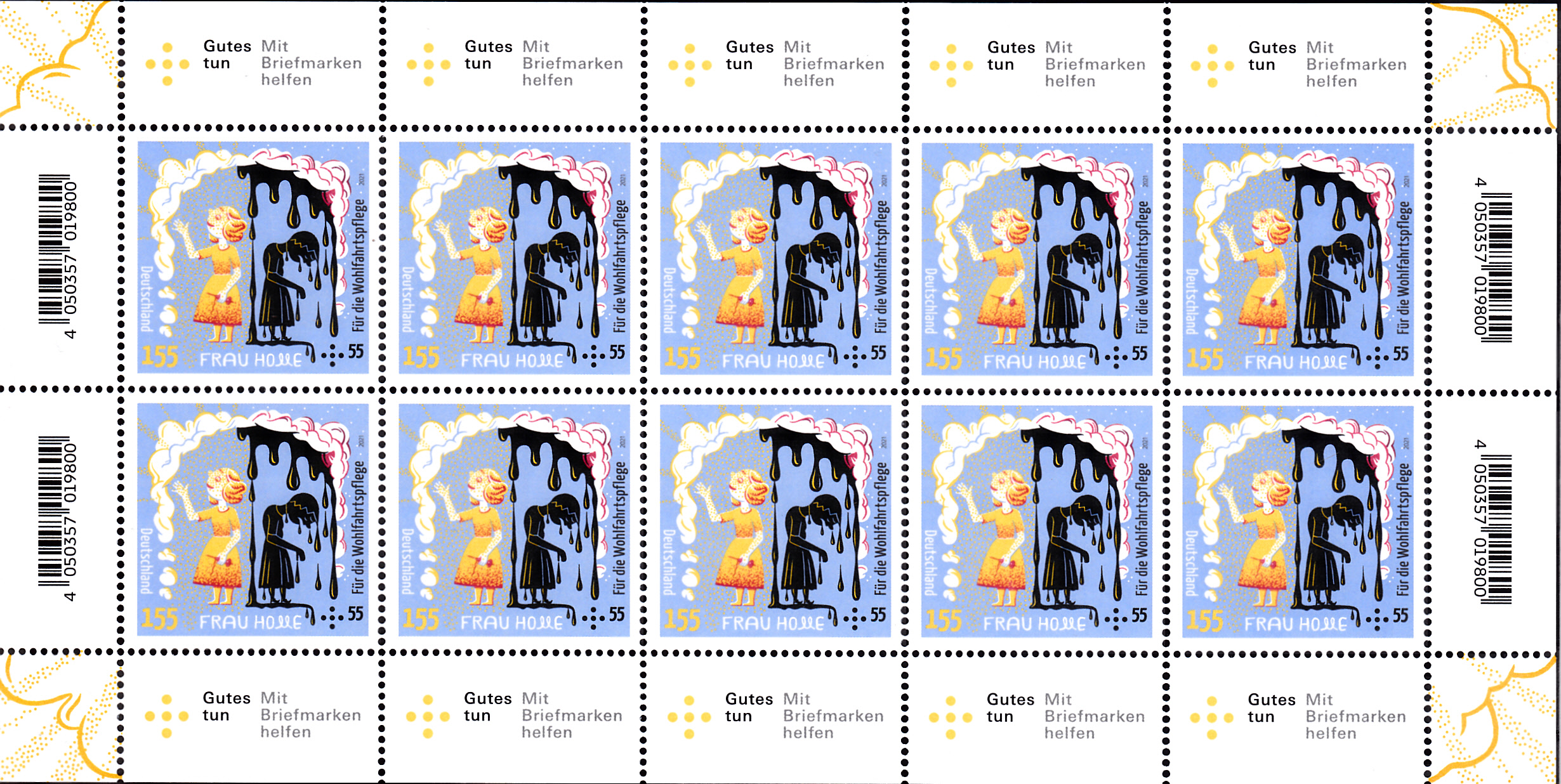 Die Darstellung auf der dritten Marke der Serie (MiNr 3587) zeigt die Belohnung für die beiden Mädchen, nämlich die Überschüttung mit Gold und Pech.