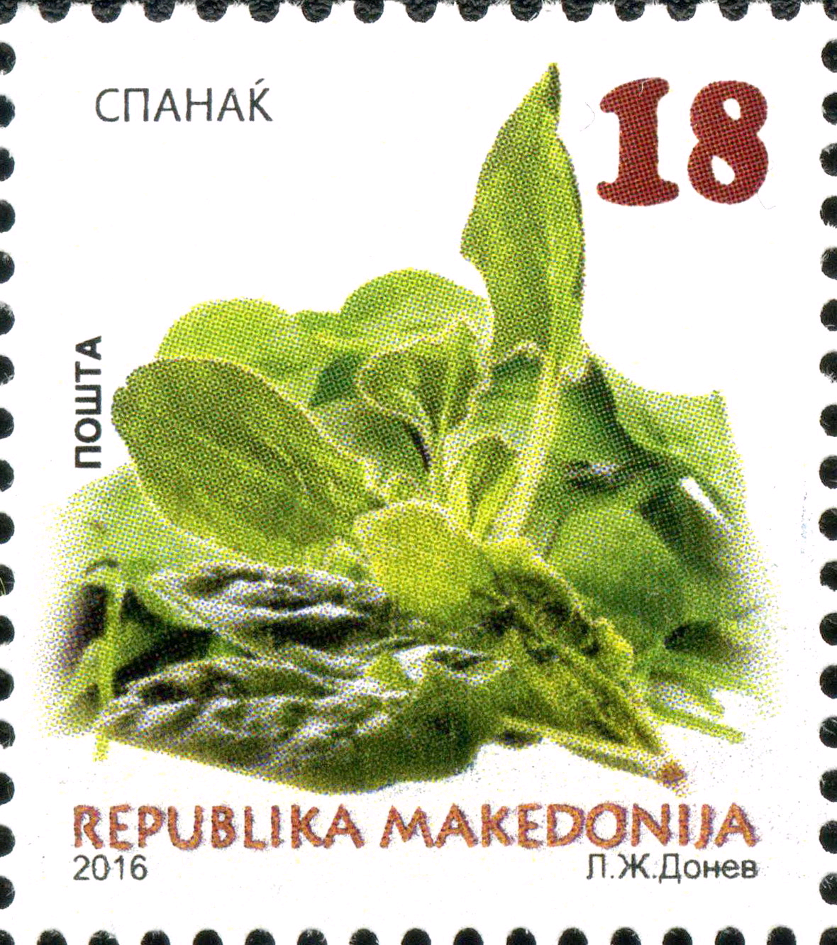 Auf dieser Marke (MiNr 784) aus Makedonien (Nordmazedonien) wird Spinat (Spinacia oleracea) gezeigt.