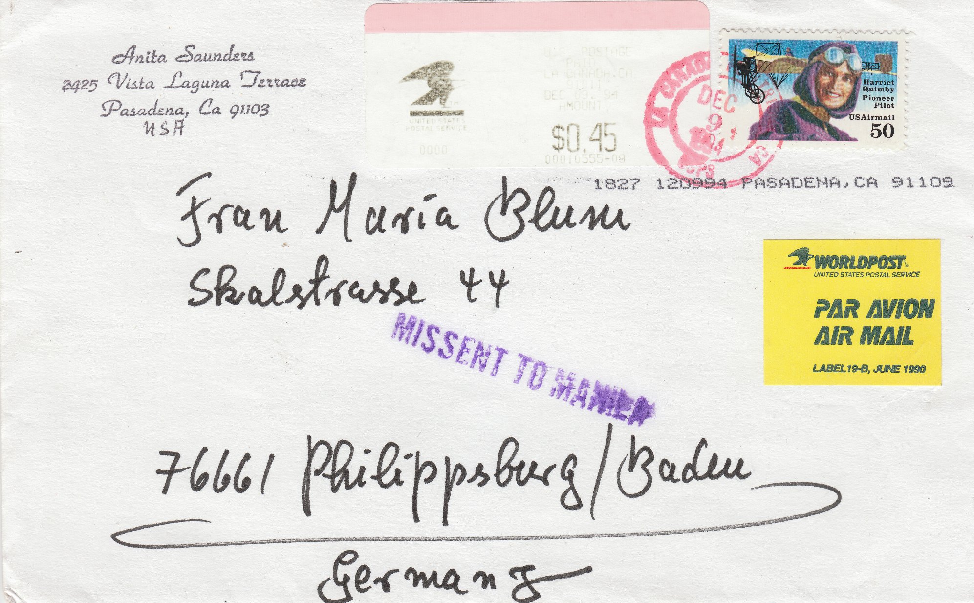 Der Brief ist adressiert nach "Philippsburg/Baden", wurde von der US-Post jedoch fehlgeleitet, "MISSENT TO MANILA", landete also statt in Philippsburg in den Philippinen.