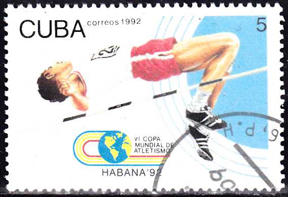 Eine Marke aus Kuba (MiNr 3608) zum Leichtathletik-Weltcup in Havanna zeigt einen Hochspringer.