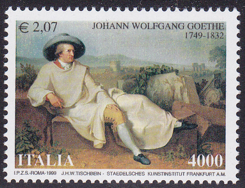 Auch Rumänien hat eine Marke (MiNr 5418) zum 250. Geburtstag von Johann Wolfgang von Goethe mit einem Ausschnitt aus dem Gemälde "Goethe in der Campagna" von J. H. W. Tischbein ausgegeben.