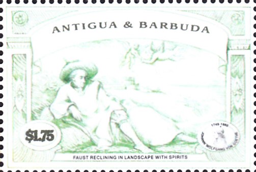 Auf einer Marke aus Antigua und Barbuda (MiNr 3009) sehen wir ebenfalls "Goethe in der Campagna" nach dem Gemälde von Johann Heinrich Wilhelm Tischbein.
