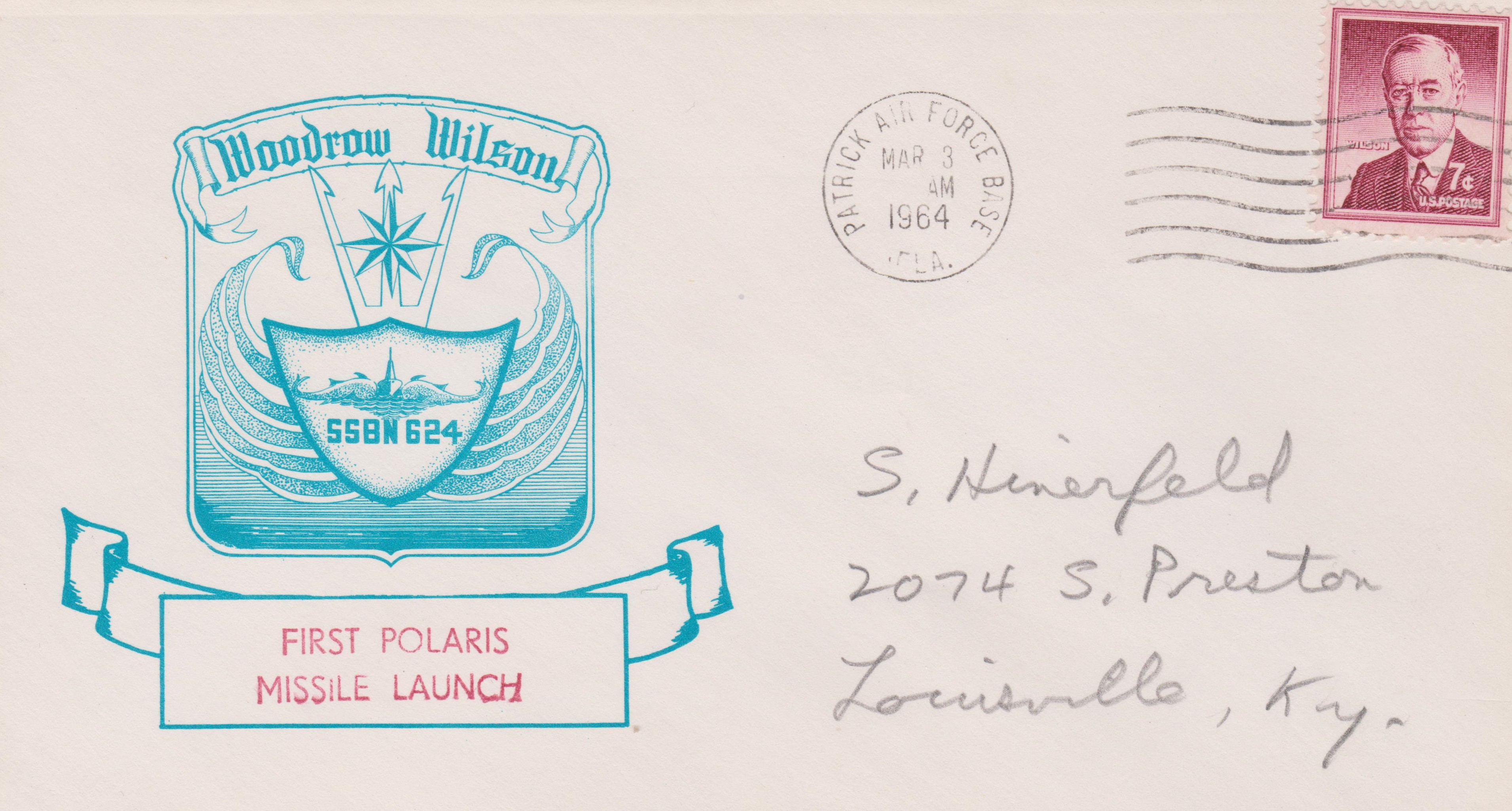 Dieser Beleg vom 16.03.1964 dokumentiert den ersten Start einer POLARIS-Rakete von Bord der USS WOODROW WILSON durch die GOLD Crew.