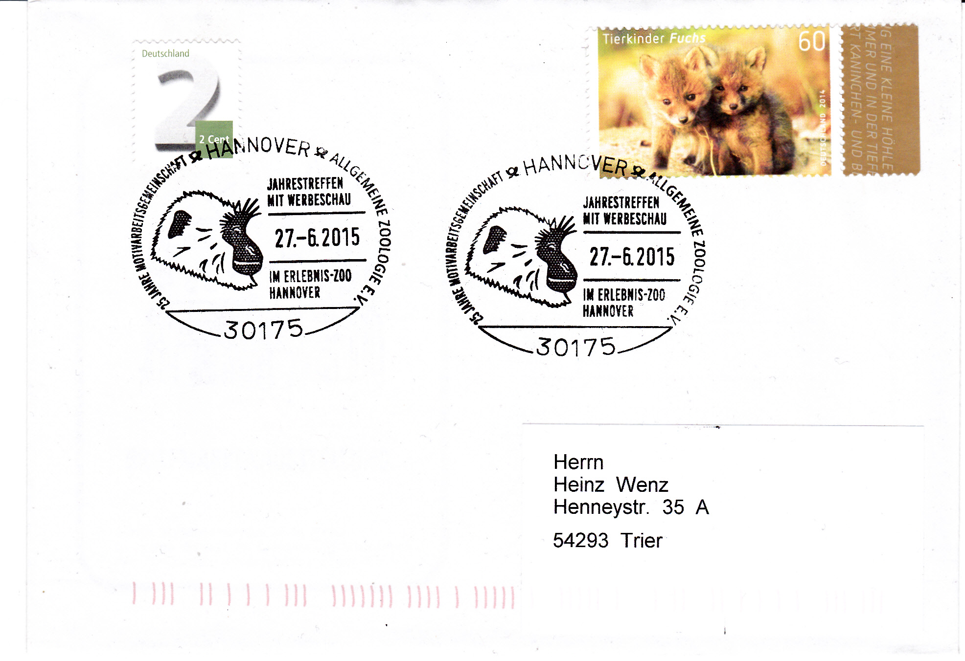 Im Sonderstempel aus Hannover vom 27.6.2015 zu einer Veranstaltung im Zoo Hannover ist der Kopf eines Hanuman-Languren zu sehen.