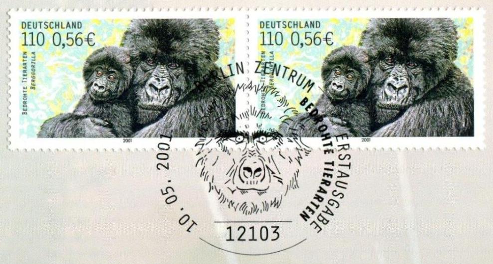 Die Bundesrepublik Deutschland gab am 10.05.2001 diese Sondermarke zum Thema Berggorilla heraus, hier ein Paar mit ESST BERLIN: