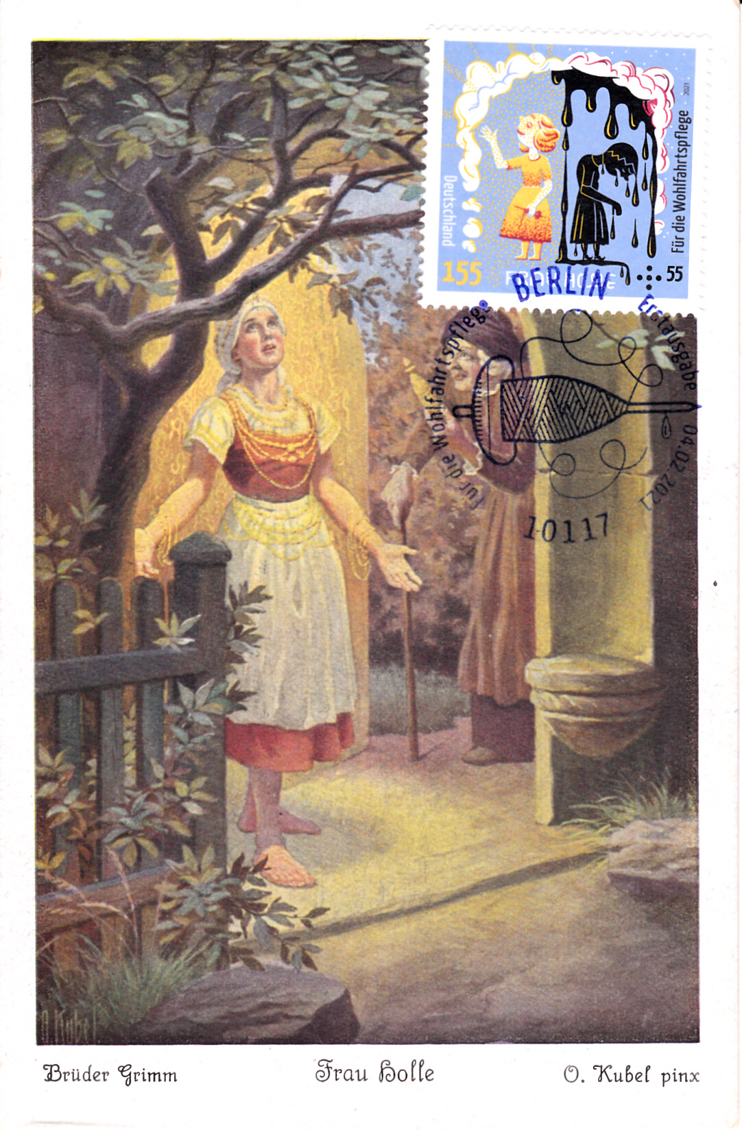 Maximumkarte mit der Marke zu 80+40 Cent aus der Serie "Frau Holle". Es wurde eine Karte der Farbenphotographischen Gesellschaft m.b.H Stuttgart aus der Serie 139 verwendet. Auf der Rückseite sind die entsprechenden Texte aus dem Märchen nachzulesen. Diese Karte hat die Nr. 3794.