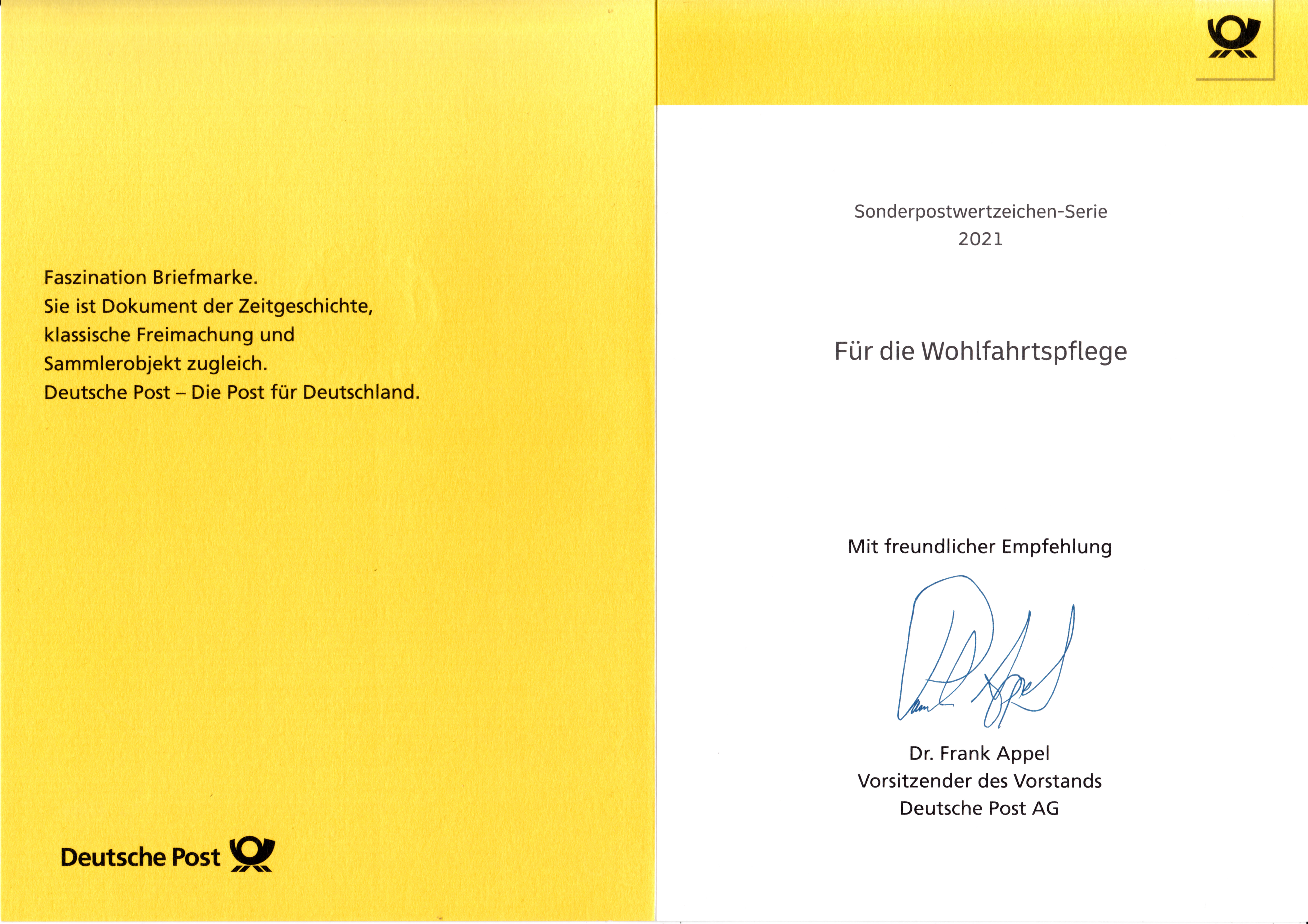 Farbige Ministerkarte des Finanzministers mit je einer Marken der Wohlfahrtsmarkenserie 2021 (MiNr 3585 bis 3587) mit Motiven zum Thema "Frau Holle". Zwei Marken sind mit den Ersttagsonderstempel Berlin gestempelt und eine Marke erhielt den Ersttagsonderstempel Bonn.