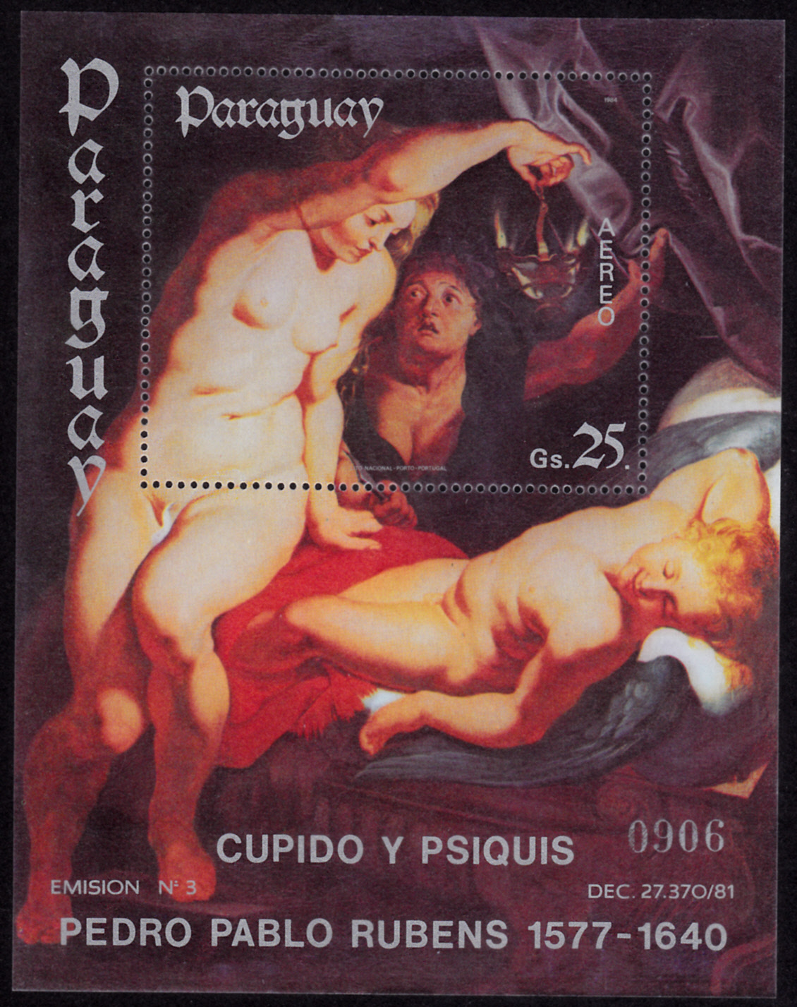 Dieser Block aus Paraguay (MiNr Block 396 mit Marke MiNr 3736) zeigt uns das Gemälde "Amor und Psyche" von P. P. Rubens.