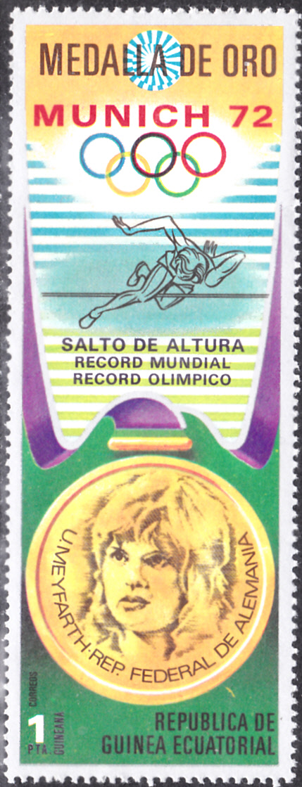 Aus einer Serie "Medaillengewinner der Olympischen Sommerspiele in München" aus Äquatorial-Guinea stammt diese Marke (MiNr 163) mit der hier schon vorgestellten Hochspringerin Ulrike Meyfahrt.