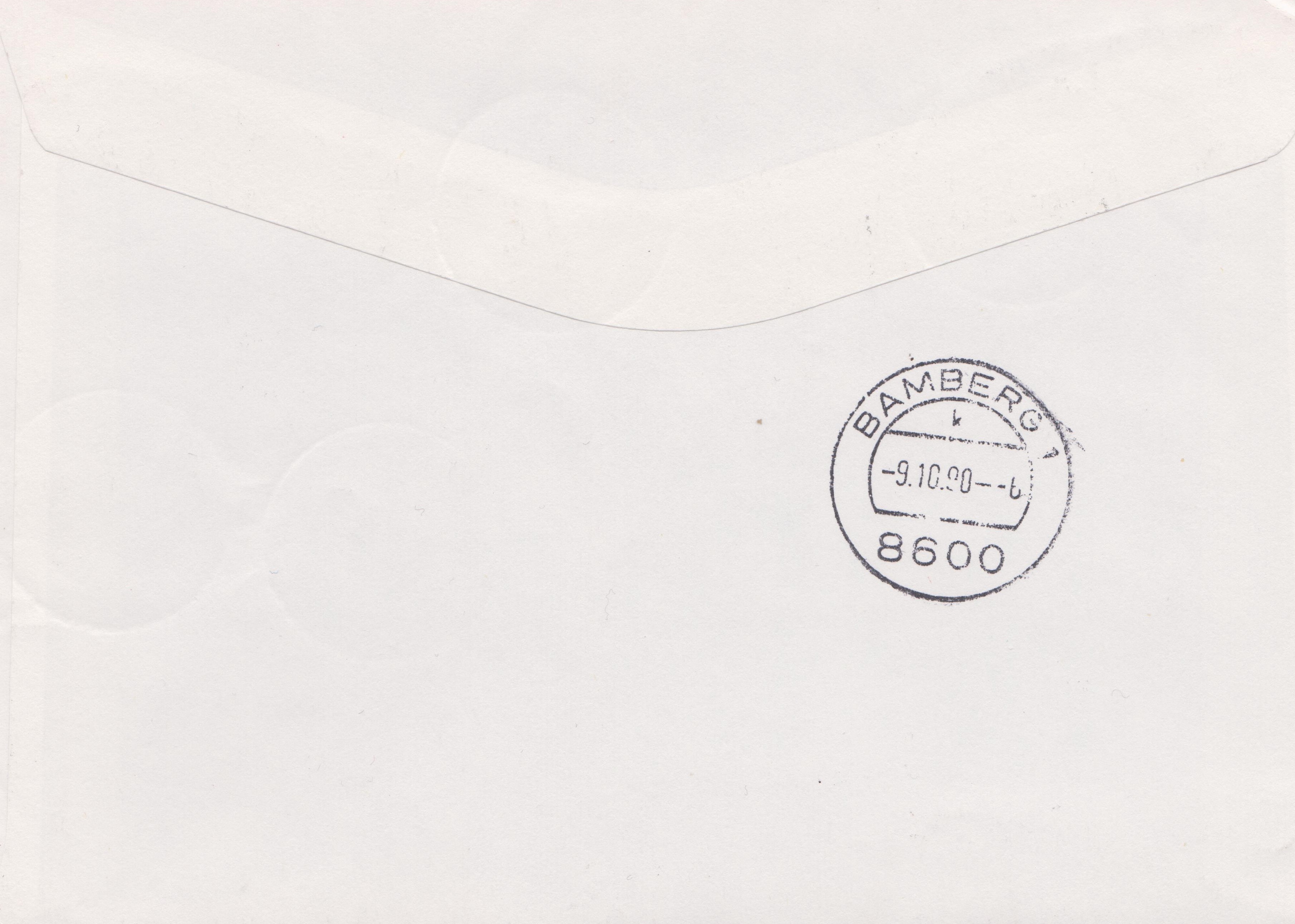 Dieser Beleg war als Brief per Eilzustellung nun aber nicht etwa 6 Tage unterwegs, sondern wurde erst am Montag, dem 08.10.1990, in Bonn aufgegeben und die Frankatur wurde während der einmonatigen "Nachstempelphase" mit dem Ersttagssonderstempel dieser Ausgabe entwertet. Eigentlich hätte bei einem Brief per Eilzustellung auch in Bonn bei Einlieferung ein Tagesstempel abgeschlagen werden müssen, was in diesem Falle jedoch unterblieb!