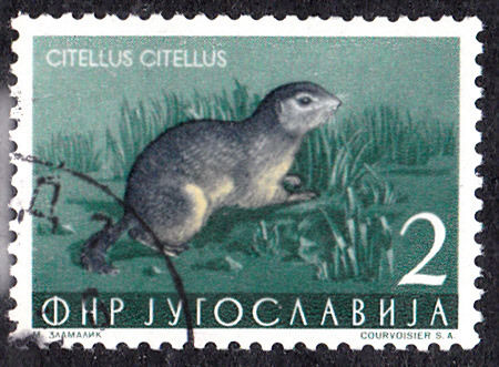 Auf dieser Marke aus Jugoslawien (MiNr 738) wird auch ein Europäischer Ziesel (Spermophilus citellus, früher auch Citellus citellus wie hier auch der Marke).