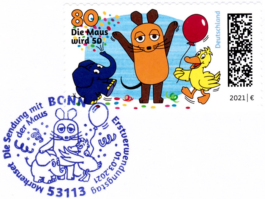 Zum Jubiläum "50 Jahre Kinderfernsehserie 'Die Sendung mit der Maus'". gab es bei der Deutschen Post eine Marke (MiNr 3596) mit der Abbildung "Maus feiert mit Elefant und Ente".