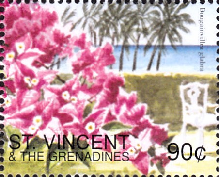 Auf dieser Marke aus St. Vincent (MiNr 3703) sind Blüten der Kahlen Drillingsblume (Bougainvillea glabra) zu sehen.