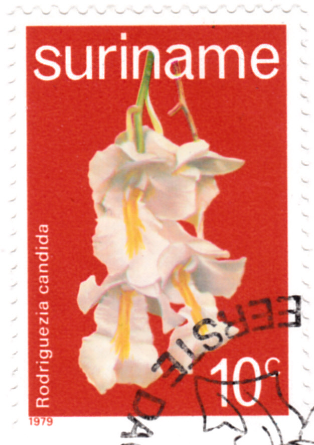 Aus einer Serie "Orchideen" aus Surinam kommt diese Marke (MiNr 854) mit der Blüte einer Rodriguezia candida.