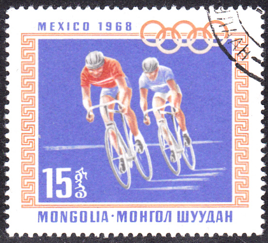 Diese Marke aus einer Serie der Mongolei zu den Sommerspielen 1968 (MiNr 513) zeigt zwei Sportler beim Straßenrennen.