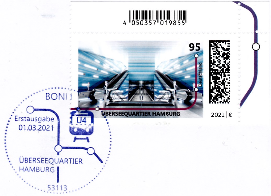 Bei der Deutschen Post ist 2021 eine Marke (MiNr 3593) erschienen, die uns einen Einblick in den U-Bahnhof Überseequartier ermöglicht. Hier zeige ich ein Eckrandstück mit EAN-Codierung.
