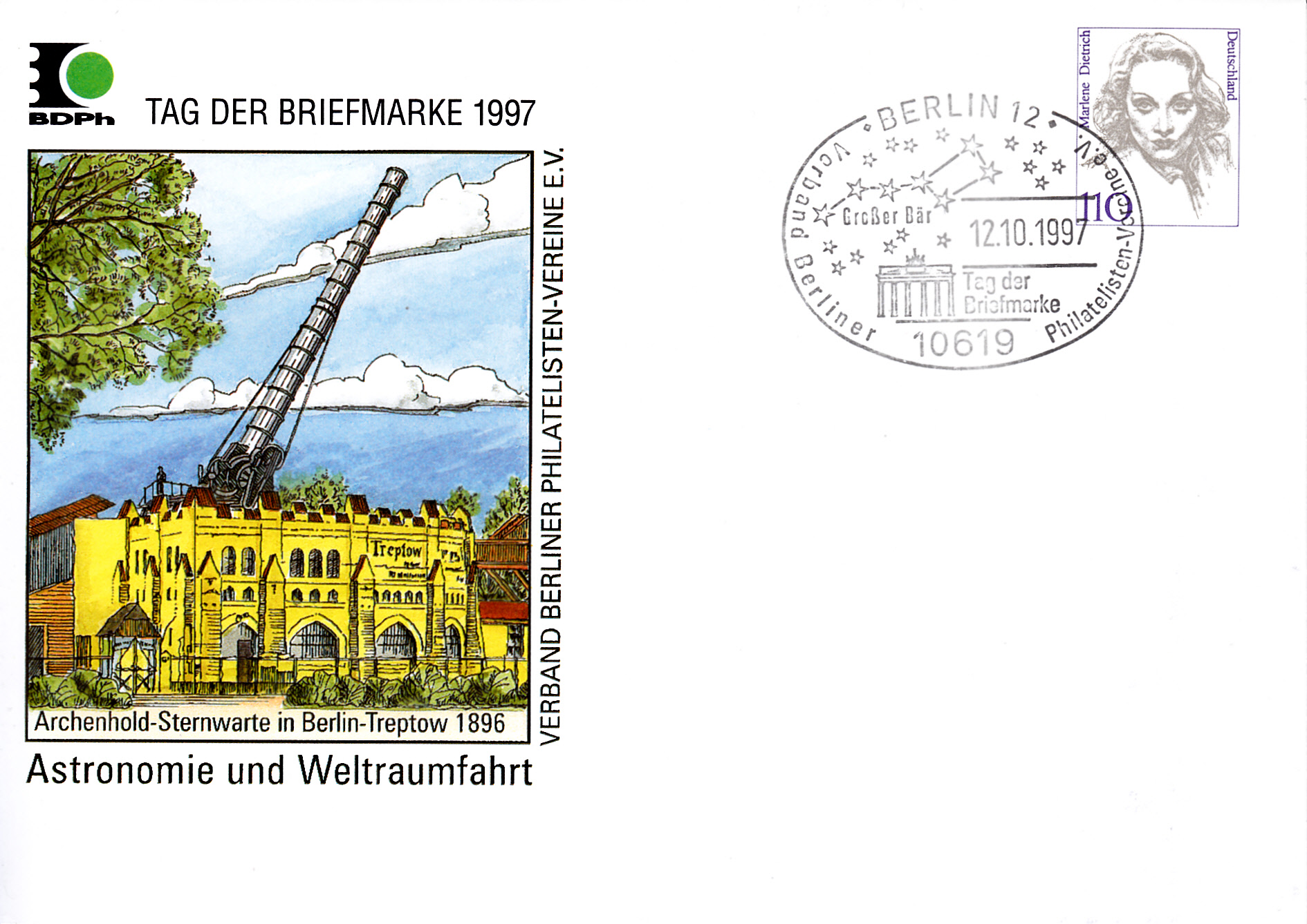 Der Verband Berliner Philatelisten-Vereine e.V. zeigt auf seinem Ganzsachen-Umschlag die Sternwarte Berlin-Treptow (1896) und im Stempelbild einen Ausschnitt aus dem Sternenbild mit dem "Großen Bär".