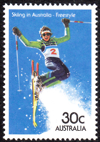 Diese australische Marke (MiNr 875) aus einer Serie "Skisport in Australien" zeigt einen Freestyle-Skifahrer bei einem Sprung.
