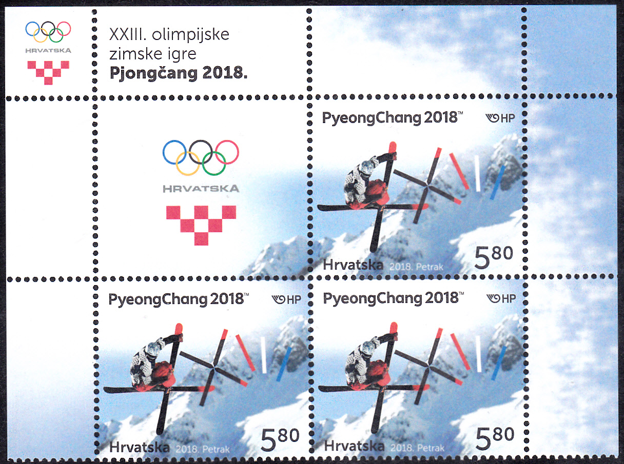 Auch auf dieser Marke aus Kroatien (MiNr 1302) zu den Winterspielen 2018 ist ein Freestyle-Skifahrer bei einem Sprung zu sehen.