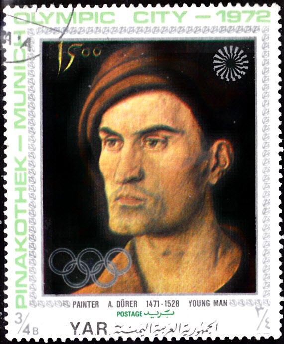 Im Jemen-Nord (Arab. Republik) ist in einer Serie "Olympiastadt München: Gemälde aus der Alten Pinakothek" diese Marke (MiNr 1330) mit dem Gemälde "Junger Mann" von Albrecht Dürer erschienen.