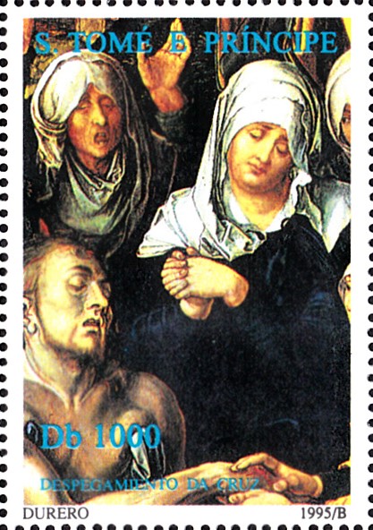 Aus einer Serie aus Sao Tomé und Principe kommt diese Marke (MiNr 1909) mit einem Ausschnitt aus dem Werk "Glimsche Beweinung" von Albrecht Dürer (um 1500). Das Bild befindet sich in München in der Alten Pinakothek.