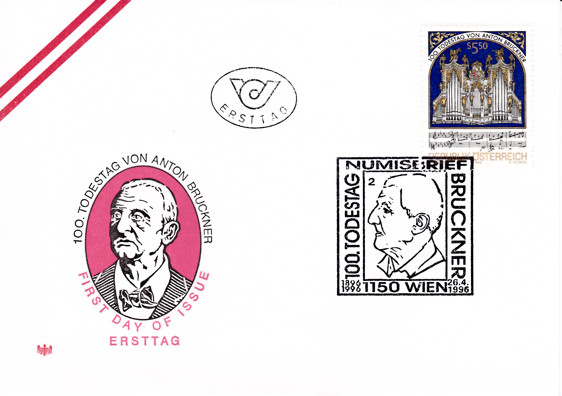 Auch in Österreich gab es zum 100. Todestag von Anton Bruckner eine Marke (MiNr 2184. Im Markenbild werden die Brucknerorgel, im Stift St. Florian und eine Notenhandschrift gezeigt.