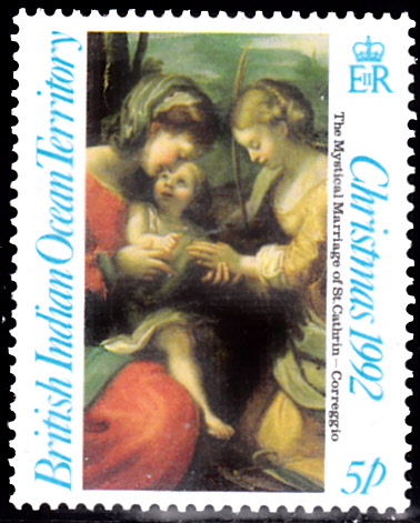 Eine Weihnachtsmarke des Britischen Territoriums im Indischen Ozean (MiNr 128) zeigt einen Ausschnitt aus dem Gemälde "Die mystische Vermählung der hl. Katharina" von Correggio.