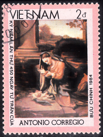 Auf der nächsten Marke dieser Serie aus Vietnam (MiNr 1508) sehen wir sein Gemälde "Anbetung der Jungfrau".