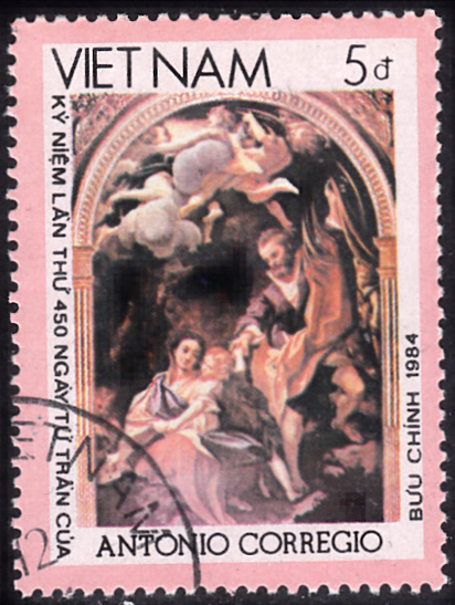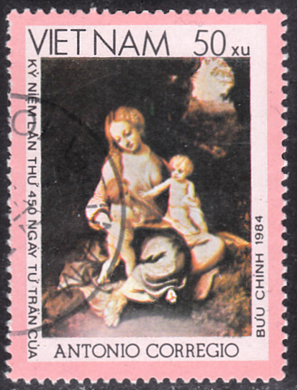 Zum 450. Todestag von Correggio ist in einer Serie in Vietnam diese Marke (MiNr 1506) mit dem Gemälde "Madonna mit den beiden Kindern" von Antonio da Correggio erschienen.