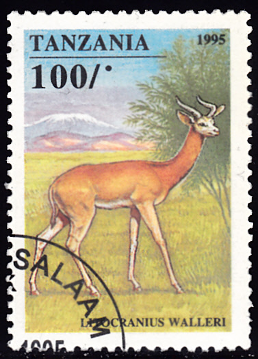 Aus Tansania kommt diese Marke (MiNr 2026) mit einer Südlichen Giraffengazelle (Litocranius walleri).