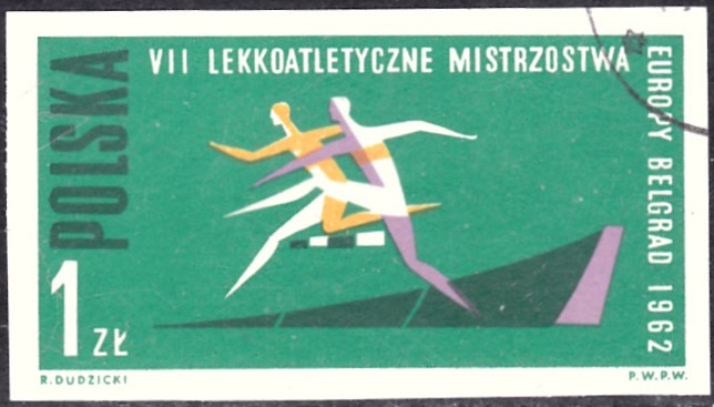 Die hier schon gezeigte Marke aus Polen zu den Leichtathletik-Europameisterschaften 1962 in Belgrad mit der Abbildung von zwei stilisierten Hürdenläufer gibt es auch als geschnittene Marke (MiNr 1341 B).